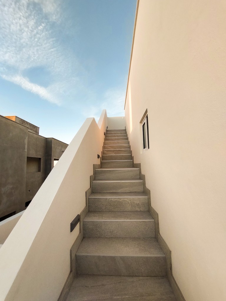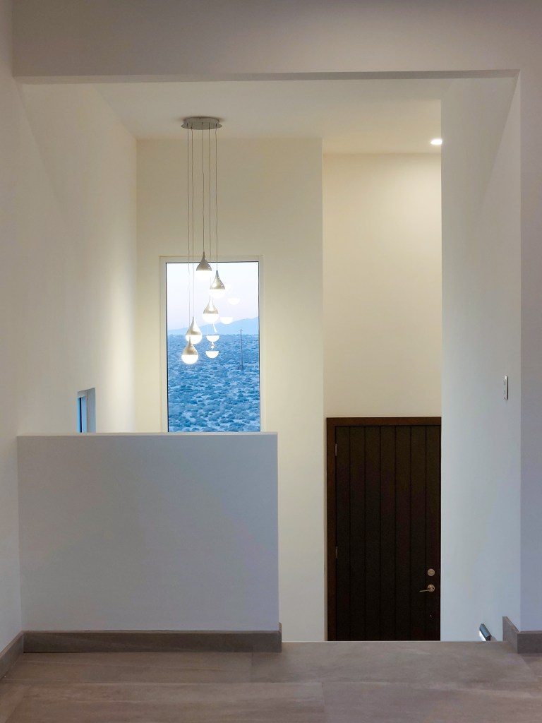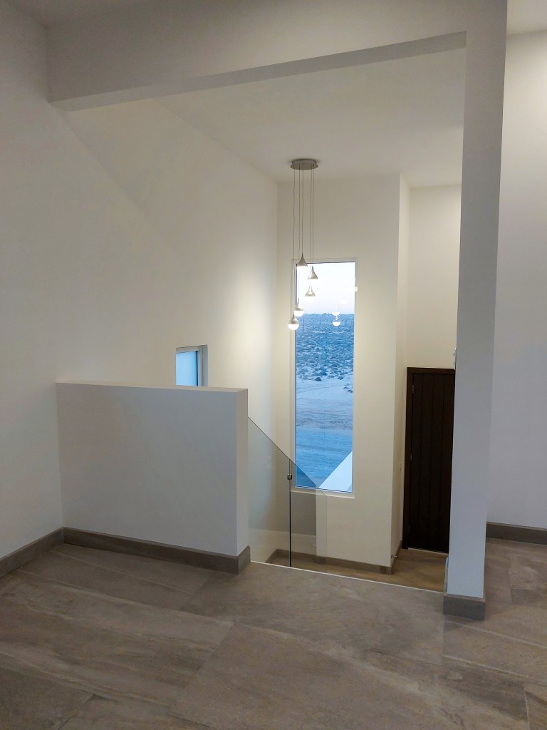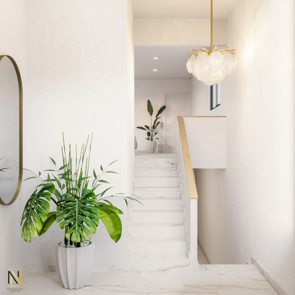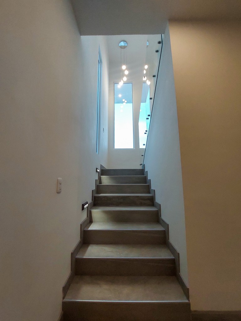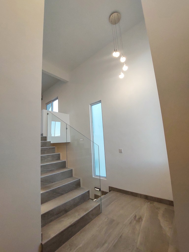 Al ingresar a la casa, uno es recibido por un elegante recibidor que se encuentra en un medio piso, lo que crea una transición suave entre los diferentes niveles de la casa. Desde aquí, una escalera bien iluminada conduce hacia arriba, hacia el corazón de la vivienda.