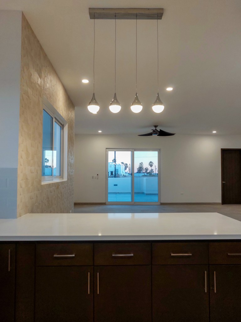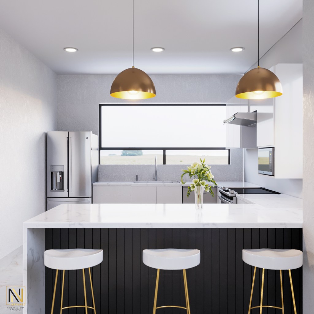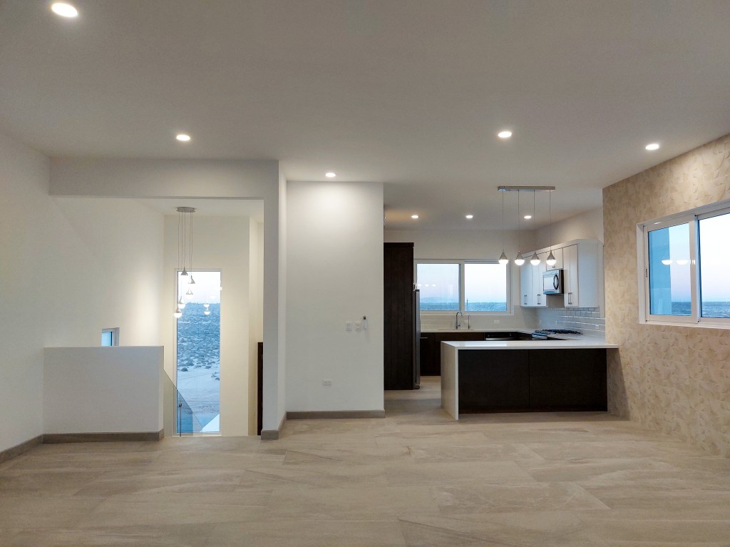 La planta alta alberga el área común de la casa, donde la cocina, el comedor y la sala se fusionan en un espacio abierto y luminoso. Grandes ventanales y puertas corredizas de cristal permiten que la luz natural inunde el área, realzando los tonos claros del diseño interior y ofreciendo vistas panorámicas de la zona.