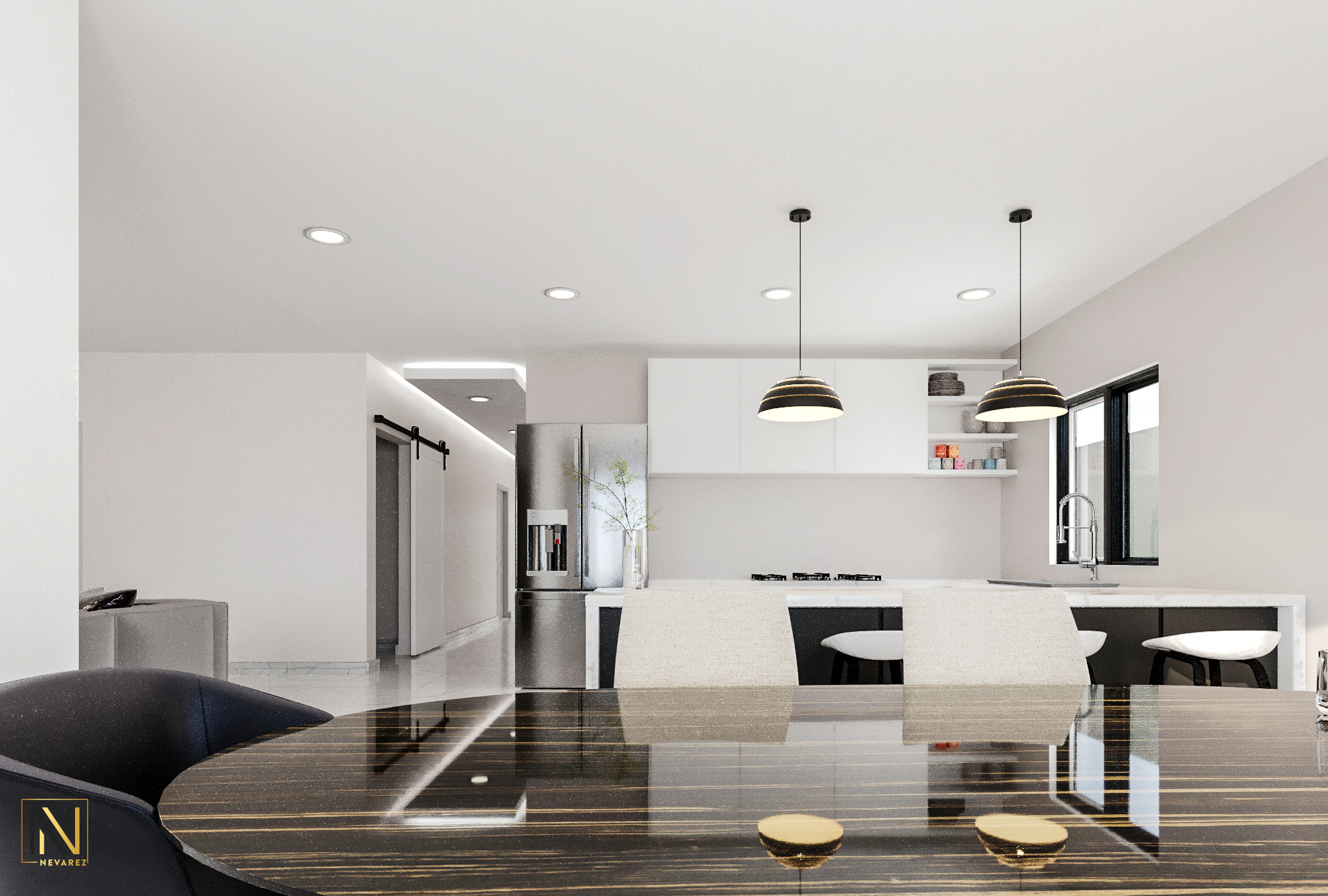 El diseño de la casa se centra en una planta abierta que integra la cocina, el comedor y la sala en un solo espacio amplio y luminoso. Esta disposición no solo fomenta la interacción familiar y social, sino que también permite una circulación fluida y una sensación de amplitud en todo el hogar. Los tonos claros en los muros ayudan a crear un ambiente fresco y acogedor.
