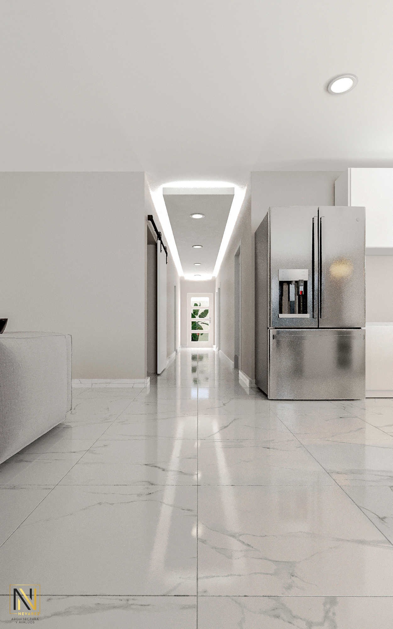 Un elemento destacado del diseño es el pasillo que conecta la zona común con las recámaras. Este pasillo actúa como un eje central que organiza el flujo de movimiento dentro de la casa, ofreciendo un acceso fácil y directo a las áreas privadas. Las tres recámaras están ubicadas estratégicamente para proporcionar privacidad y tranquilidad, siendo perfectas para una familia en crecimiento.