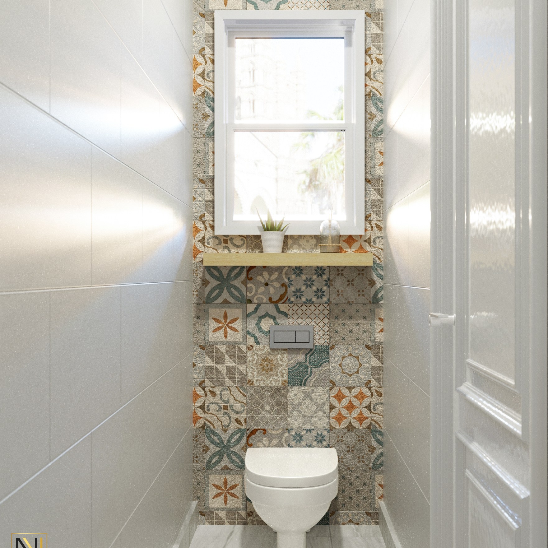 El corazón del diseño es la regadera, que se destaca por la incorporación de un tragaluz. Este elemento arquitectónico permite que la luz natural inunde el espacio, creando un ambiente cálido y acogedor. Durante el día, el tragaluz ofrece una iluminación natural que realza los tonos del mosaico y acentúa los detalles del diseño, mientras que por la noche, la luz artificial se refleja de manera uniforme, manteniendo la atmósfera serena y relajante.