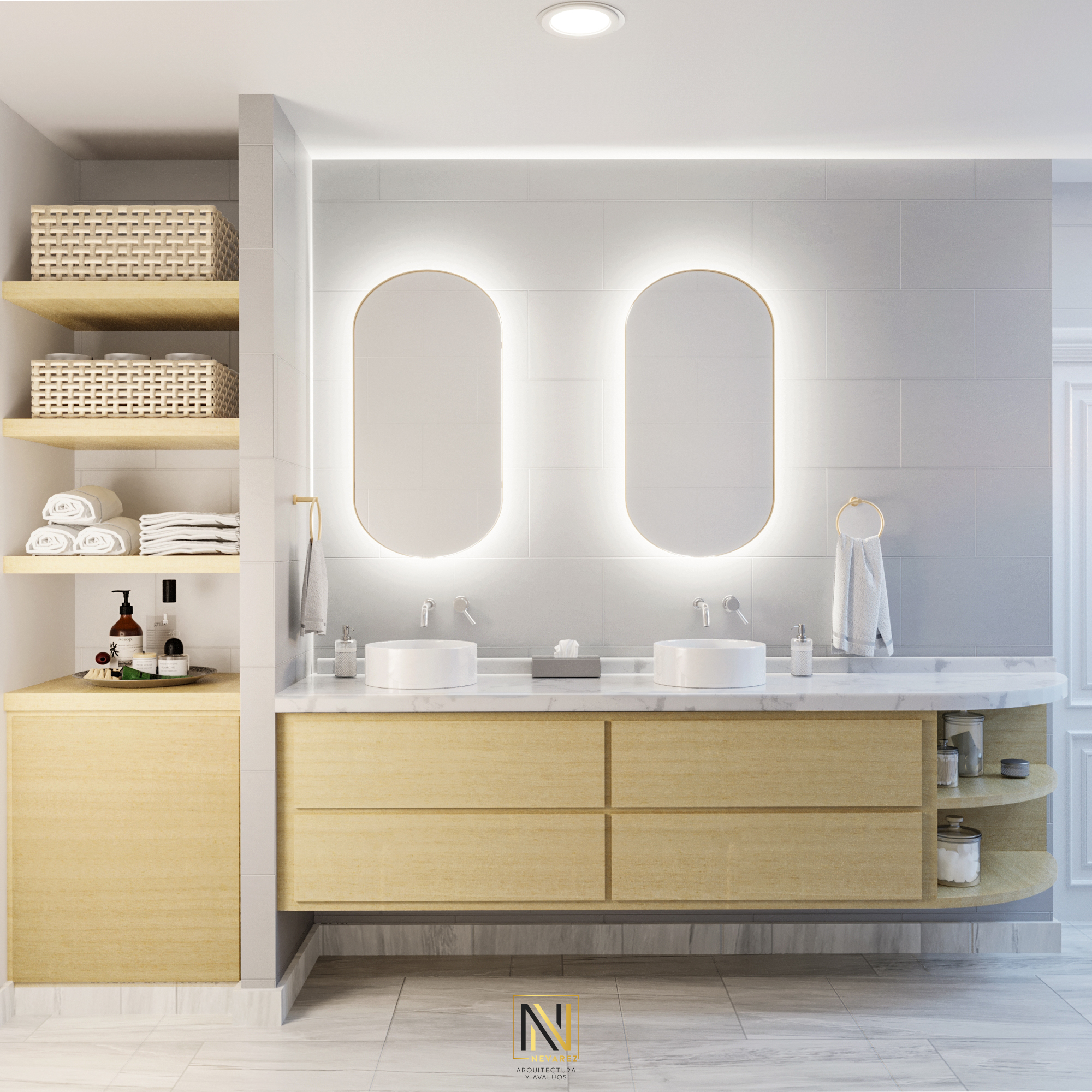En nuestro proyecto ‘Estilo y Comodidad: Rediseño de un Baño Moderno’, nos enfocamos en crear un espacio que fusionara elegancia y funcionalidad. Hemos elegido tonos claros como base para el diseño, lo que aporta una sensación de amplitud y luminosidad. El muro de la regadera está revestido con un mosaico cuidadosamente seleccionado, caracterizado por sus delicados patrones y su textura suave, que añade un toque de dinamismo al ambiente.